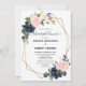 Janto geométrico de ensaio floral azul-escuro, azul-marinho, com convite com buquê elegante de azul-marinho, azul-real, branco, rosa-pincel e folhas de eucalipto verdes-sábio e elegante quadro neutro geométrico de brilho. Entre em contato comigo para obter ajuda sobre a personalização ou se você precisar de outro produto com este design