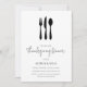Janto Moderno de Ação de Graças Chic. Design preto e branco moderno com texto escrito à mão, escrito à mão, escrito em chic, com texto escrito à escritura, e garfo, faca e colher - mostrado a preto. A parte traseira é mostrada em preto sólido. Personalize com os nomes do host, dia, data, hora, endereço do local e detalhes de RSVP. Todo texto, fontes e cores são personalizáveis. Excelente para jantas pessoais, ou clube, grupos, empresas, corporações, partidos de empresas. Convidamo-lo a visitar a nossa loja Zazzle, Austen & Grace, para combinar produtos e muito mais. Entre em contato conosco se precisar de assistência.