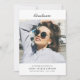 comemore sua formatura com este design preto e branco sobre fundo preto com uma bela foto. Este design de cartão de graduação tem anúncio de formando no convite de janto de apresentação e graduação no verso. Você pode mudar a foto, o texto e as cores.