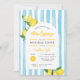 Ponha o tom para uma celebração nova e festiva com este convite de janto de ensaio de compressão Principal! Apresentando um tema vibrante sobre limão de verão, este design inclui limões aquarelas em volta de uma estrutura arquitetônica, tipografia moderna minimalista e um fundo de listras de cabana azul-aqua. Na moda e divertido, é perfeito para uma reunião de pré-casamento elegante e de repouso. Disponível como placas impressas profissionalmente ou um download digital conveniente.