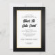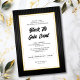 Este convite para o janto Black Tie Gala apresenta um tema na moda adornado com fundo preto e faixas verticais de cinza clara. Uma caixa branca com borda dourada contém texto personalizado para que você adicione os detalhes do evento. O design oferece um senso de classe e sofisticação, definindo o tom para um evento memorável.