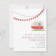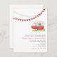Um convite de janto de ensaio de casamento com ilustração de um trailer vermelho com um cheio de margaridas e suspiros de olhos pretos. Vermelho e cinza no topo. Personalize o texto.