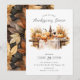 Este convite de Ação de Graças apresenta uma mesa rústica de madeira cheia de abóboras, flores de outono e vinho. O convite é simples e elegante, com fundo branco e texto preto. A mesa russa de madeira adiciona um toque de calor e conforto.
