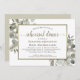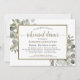 Este belo convite de janto de ensaio apresenta um monte de impermeabilizantes pintados manualmente de folhas de eucalipto com ramos de pinheiro e folhagem de inverno em tons de verde-sábio e ouro. O design de música 'boho' rústico inclui um quadro de ouro de folha falsa e uma caligrafia de script lacy. Tem espaço para todas as informações sobre o ensaio e janta manter a festa de casamento informada.