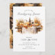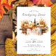Este convite para apresentação de amigos apresenta uma mesa rústica de madeira cheia de abóboras, flores de outono e vinho. O convite é simples e elegante, com fundo branco e texto preto. A mesa russa de madeira adiciona um toque de calor e conforto.