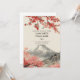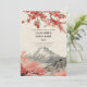 This wedding invitation features a japanese landscape of a traditional structure with sakura trees near it and a mountain in the background.