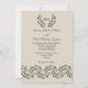 O convite para o casamento da garland e da coroa de oliveiras, que inclui uma fila de ramos de oliveira que formam uma praça em fundo bege e uma coroa de oliveira com as suas iniciais. Este design moderno e contemporâneo, mas clássico, com elementos gregos tem uma sensação retrógrada/vintage. É uma parte completamente personalizável de um modelo de casamento perfeito para um casamento que acontece na Grécia ou um casamento com apenas um tema/estilo grego.