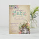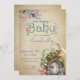 Esse convite de chá de fraldas mágico e caprichoso apresenta um tema de floresta encantado. Uma imagem de uma porta de fada em um pequeno jardim de cogumelos é colocada no fundo, com uma fada flutucando sobre ela. O fundo é um estilo antigo, padrão de papel pergaminho desbotado.