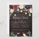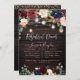 Jarras de Mason para Jantar de Ensaio Rústico, Cordas de Luz. Apresentando painéis de madeira rústica escura, flores em aquarela em boho burgundy e blush e rosas navy. Acentuado com convite de casamento elegante e moderno com escrita à mão em dourado falso (com filtro prateado). Cor de fundo DIY.