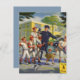 Clique aqui para acessar as ferramentas de design para alterar a cor de fundo e adicionar seu próprio texto personalizado! Muitos estilos de fonte a serem escolhidos! Ilustração Vintage mostra crianças imagem com um policial atuando como uma guarda de cruzamento ajudando um monte de crianças, um jogador de beisebol esportivo, a atravessar uma rua em segurança. O prédio da escola está atrás deles e um letreiro infantil lento está no canto.