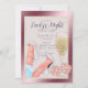 Estes convites de festas personalizados glamourosos e elegantes apresentam um tema "Ladies Game Night" num fundo metálico ou cromo, brilhante e cor-de-rosa escuro. Um copo de champanhe espumante, dados brilhantes cor-de-rosa, e os saltos da senhora são fotografados no fundo.