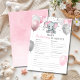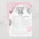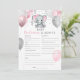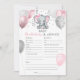 Este cartão de chá de previsão do bebê apresenta elefante rosa e cinza com balões e confete. Perfeito para os seus hóspedes brincarem.
