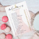 Placa de jogos de diversão e na moda ou de chá de panela de noivo. Jogo divertido para jogar na sua festa de chá de panela. Vestido cor-de-rosa pincelado elegante com cabide dourado exibido no fundo. O cartão de jogo pode ser personalizado com sua lista de perguntas. Arte original e design por Paparia de Moodthologia.