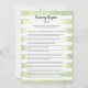 Aproveite este jogo de chá de fraldas do Nursery Rhymes Quiz no fundo das listras de aquarela suaves, verdes e brancas. Coelho bonito, branco e coelho nas costas com modelos criados para você.