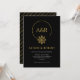 Este convite para na moda e casamento preto contém sotaques florais e as iniciais do casal impressas em fundo preto. As iniciais do casal são escritas em caracteres sofisticados, dentro de um quadro de inspiração para o corante, com um detalhe floral situado numa extremidade. Para um toque extra de classe, o verso da placa apresenta um padrão diagonal impressionante dos nomes dos casais em ouro luxuoso a preto.