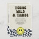 O convite de 3 anos e o convite de 3 anos para apresentação feliz convida crianças Legal e divertidas convites de festas de aniversário de 3 anos com tema Retroativo apresentando estilos retrorreflectores Legal com padrão verificado e rosto felizO texto diz "jovem, selvagem e três". Perfeito para a festa de aniversário de um menino.