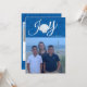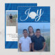 Um cartão com fotos de férias de praia que traz uma grande foto na frente com a palavra Joy. Há uma casca no lugar do O para lhe dar um tema náutico. Personalize com um nome no verso, 3 fotos e uma mensagem de feriado.