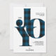 Os cartões tipográficos de Cartões de natal russos e modernos apresentam "JOY", soletrado em letras com xadrez de búfalos azul e preto / padrão checado, com espaço para mensagens pessoais. Personalize com ano, nome(s) ou saudação personalizada abaixo. Personalize a parte traseira com a foto do retrato do quadro do cheio.