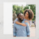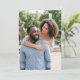 This wedding invitation features a warm and intimate design with two individuals in a close, affectionate pose. The layout is centered around the figures, set against a blurred background of greenery and urban architecture, creating a natural yet sophisticated setting. The color palette includes soft blues and rich browns, complemented by vibrant greens, enhancing the cheerful and loving mood. The photographic style captures realistic details and textures, emphasizing authenticity and connection, making it perfect for celebrating a joyous union.
