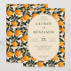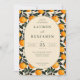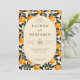 This wedding invitation features a playful yet elegant design with a central oval frame set against a vibrant border of stylized oranges and green leaves. The color palette includes cheerful oranges, deep greens, and a soft beige background, creating an inviting atmosphere. The layout is symmetrical, with clean lines and ample negative space enhancing readability. Sophisticated typography combines serif fonts for the names and sans-serif for details, ensuring clarity and style. Perfect for couples seeking a joyful and botanical-themed celebration, this design captures the essence of a lively and festive occasion.