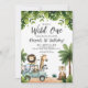 Animais Selvagens Safari Selvagem Um Convite de festas primeiro aniversario. Uma tomada divertida e adorável do clássico tema de primeiro aniversário "Wild ONE", perfeito para o dia especial do seu pequeno aventureiro. Esta design divertida apresenta um vivo grupo de animais da selva e safari, incluindo um leão amigável, tigre, girafa, zebra e um macaquinho malicioso — embora nenhum ursinho desta vez, é muito divertido! Os animais estão montando juntos em um carro azul-téal safari fora da estrada, iniciando uma jornada excitante através da natureza selvagem. As palmeiras circundantes e as folhas verdes escorridas acrescentam um toque vibrante, com uma palmeira adicional no lado esquerdo para melhorar a atmosfera da selva. O design é simples e cheio de charme, fazer excelente para uma celebração neutra em termos de gênero. O texto está atualmente em uma cinza escura na moda, complementando a estética geral, mas você pode personalizar facilmente as cores da fonte para corresponder ao tema do seu partido. A parte de trás do convite é vazio, permitindo que você adicione uma mensagem manuscrita ou a deixe como está para uma aparência simples e limpa. Disponível como um convite físico ou um download digital, que lhe dá a flexibilidade para impressão em casa, enviá-lo digitalmente ou mandá-lo para impressão profissional. Perfeito para o primeiro grande marco de qualquer explorador!
