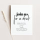 Se você ama clássico, este convite de estilo simples e acolhedor é ideal para você. O convite apresenta um design elegante, com um fundo branco com detalhes delicados da festa lindamente escritos em um texto preto que exala sofisticação. Receba os convidados para o seu jantar de inauguração com estilo. A cor de fundo e o texto são editáveis.