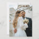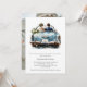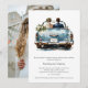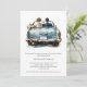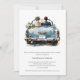 This charming reception-only invitation features a whimsical watercolor illustration of a newlywed couple riding away in a vintage blue convertible, accented with soft floral details and a joyful, celebratory feel. The artwork is light and airy, set against a clean white background that keeps the focus on the romantic scene. Below the illustration, elegant, classic typography presents the reception details in a warm and inviting tone, making it clear that guests are being welcomed to celebrate the marriage after an intimate ceremony. The overall design blends vintage charm with modern simplicity, perfect for a relaxed yet stylish post-wedding celebration.