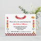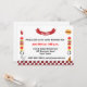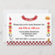 Um convite de churrasco com uma borda de gingham branco e vermelho. Dois peitos, utensílios e sotaques de comida, enfeites, decoram os lados No topo, uma faixa vermelha de fita, com texto anunciando sua festa de CHURRASCO.