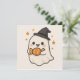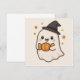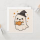 Um fantasma do estilo kawaii adorável segurando doces, vestindo um chapéu de bruxa, e rodeado por estrelas ouros. Perfeito para amantes bonitos do Halloween e fãs de estética pastel spooky. Excelente para autocolantes, canecas, sacos de tote e t-shirts.