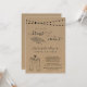 Convite apresenta ilustrações de kebabs e brinde com cerveja em um fundo kraft rústico maravilhoso.