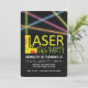Meninos bonitos marcam convites de aniversário de laser com fundo preto, uma arma laser, feixes de laser multicoloridos e um modelo de texto moderno editável.