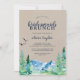 Este convite às damas de ponte de Rocky Mountain é perfeito para um evento ao ar livre. O design apresenta uma paisagem de natureza selvagem pintada, azul e verde, com pinheiros de aquarela, pássaros e montanhas em um fundo falso de papel kraft claro. Por favor, observe que isto não está impresso em papel kraft real. É um gráfico de alta qualidade feito para parecer papel kraft.