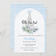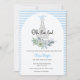 Este elegante convite de chá de fraldas, azul e branco Oh La Paris inspirado será o começo perfeito para o seu chá de fraldas temático francês. Apresentando a Torre Eiffel, um arco de moda e flores românticas. Um bebê romântico azul convida para um chá de fraldas de Paris.