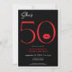 Moderno e sofisticado, este convite de aniversário declara, "ela está fazendo 50" e combina preto e branco clássicos com sotaques de vermelho brilhante, com um par de lábios divertidos. Seu design minimalista é simples e divertido para celebrar o aniversário marcante. O verso contém uma área para um código QR para resposta de RSVP. Criado por Simply Farmhouse Press.