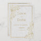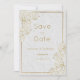 Um elegante lugar floral francês branco e dourado, design de folha de ouro tropical com tipografia dourada escrita à mão. Esse casamento de luxo da moda Salve a data são o impressão perfeito para qualquer evento de casamento de noiva e noiva. Personalize este design com seus detalhes e monograma inicial. Todas as designs são impressas.