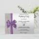 Convites de aniversário personalizados elegantes, glamorosos e sofisticados. Com um belo fundo de prata gradiente e lantejoulas pratas com uma borda separadora de um laço de faixa de efeito de seda roxa deslumbrante. Os detalhes do seu evento são impressos na frente deste cartão romântico, já a parte traseira tem apenas o fundo gradiente prateado. Este é um design moderno, romântico, sofisticado, elegante e fashion adequado para aniversários femininos. Todo o texto é totalmente personalizável para atender às suas necessidades.