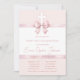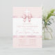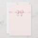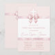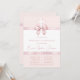 Uma fita cor de rosa, design para a primeira comunhão de uma menina. As áreas rosa e branca são separadas por fitas cor de rosa. A fita acima tem um laço sobre uma cruz branca. As fitas são pintadas em aquarela. O texto é uma tonalidade mais escura de rosa. O nome é escrito em letra cursiva. A data é escrita na fita inferior. As informações sobre a cerimônia de batismo e o almoço posterior estão em duas colunas separadas por uma linha.