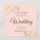 Este simples convite para o casamento apresenta um fundo cor-de-rosa pálido e pincelado, com rolhas de ouro de folha fina e suja, e espirais nos cantos. A redação é formal com a elegante escrita em letras douradas.