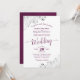 Este belo convite para o casamento apresenta um design simples, mas elegante, com uma caligrafia púrpura ou magenta em um fundo branco e um filigre de folhas de cinza prateada friamente nos cantos. A formulação é formal, mas a disposição é moderna e na moda.