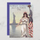 Mande fogos de artifício para seus amigos em 4 de julho! Esta vintage em 4 de julho, impressão, retrata a senhora liberdade carregando uma bandeira americana, a Estátua da Liberdade atrás dela.