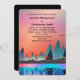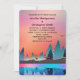 Convite de casamento com um belo design gráfico que apresenta um lago pacífico com veados. e pinheiros altos que se refletem na água. Estrelas sobrepõem-se.