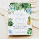 Este convite para chá de fraldas inclui folhas de palma de aquarelas de praia, florais de hibisco azul e um abacaxi tropical giro. Este convite divertido é a adição perfeita ao seu evento de festa de chá de fraldas de menina da Aloha luau. Par com qualquer coisa na Coleção Lalani para um olhar coeso.