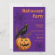 O convite do partido Modern Halloween, que inclui teias de aranha nas esquinas da design com o "Halloween Party" (Festa de Halloween) exibido na tipografia laranja com um pássaro negro engraçado e Jack Lantern em um fundo preto e roxo. Personalize o convite para a festa do Dia das Bruxas em preto e laranja com os detalhes do seu partido.