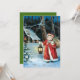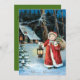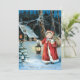 Hora de celebrar as férias. Este impressão de natal vintage retrata um lindo carregando de garotinha, uma lanterna, e um saco de doces. Uma cabana de inverno ao fundo.