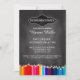 convites de festas de aposentadoria festivos para professores com tema de quadro-negro - Retirement Party'' no topo, de branco, contra um emblema falso de quadro-negro com uma imagem de borda com brilho prateado. A parte inferior tem uma borda de fotos de lápis coloridos e brilhantes. Faux preto, fundo do quadro de proteção. Personalizado com o nome do professor em chic, escrita. As informações personalizadas sobre a aposentadoria de professores, incluindo detalhes de RSVP, são impressas em letras brancas abaixo. A parte de trás tem um fundo de quadro negro correspondente.Nota: Todas as imagens são impressas. Não é um erro real. A divertida e única aposentadoria de professores de arte elementares convida para serem personalizados com seus próprios detalhes personalizados. Não apenas para aposentadorias de professores. Complementa as festas temáticas em preto e prata ou em quadro negro. Perfeito para a aposentadoria de artistas ou temas de festas de arte também.