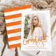 Convites de festa de formatura de tendências que incluem o dentro de fotos do formando de um quadro de máscara texturizado com "Formando" em um script manuscrito cor de laranja. Personalize a frente dos convites para festa de formatura de fotos adicionando o nome do formando, o nome da escola e o ano de graduação. O convite reverte para exibir seus detalhes de festa de formatura com um padrão listrado em laranja e branco.