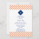 Padrão de quatrefoil laranja e convites de chá de panela azuis reais com monogramas. Um padrão simples e elegante. O fundo é branco.