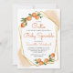 Este convite para o bebê do templo dos citros apresenta um quadro geométrico dourado adornado com laranjas aquáticas. O texto personalizável está no moderno roteiro laranja de escrita manual e sans negras serif. Personalize-o com o nome da futura mãe e os detalhes do chá. A parte traseira da placa é uma forma pastel de laranja que corresponde aos realces de aquarela na parte frontal. Ideal para um chá de fraldas de verão!