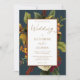 Um buquê floral etéreo em tons de branco de inverno, ouro, laranja e vermelho escuro com verde em um painel branco, dourado e laranja enferrujado sobre um fundo negro convida seus convidados para o que é certamente uma ocasião elegante de "Casamento" rústico memorável. As costas apresentam um fundo laranja enferrujado escuro. Basta adicionar seus nomes e detalhes do casamento para completar. Design composto por Holiday Hearts Design (direitos reservados).
