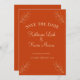 Este é um estilo minimalista personalizável Salvar o convite de casamento de Data em laranja escuro. O texto e as folhas estão em cor amarelo-macio. É perfeito para um tema tropical ou casamento outono.